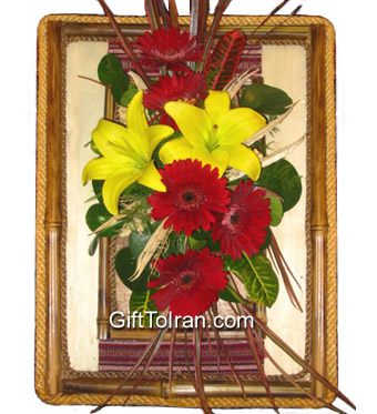 This arrangement includes Lilium and Gerbera. The frame size is 40 cm x 30 cm.