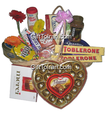 This Gift basket design and decorate professionally with ribbon and flower and it contains: Diamond (290 gr), Merci (250 gr), 2 big Toblerone (400 gr), Quality Street (450 gr), Nestele Gold (100 gr), Coffee mate (320 gr), Eslais (100 gr), choceur chocolate (200 gr), Dairy Milk (250 gr), Kinder (100 gr), Galaxy jewels (200 gr), Kalfany cola (150 gr), M & M's (100 gr) (esmartiz).