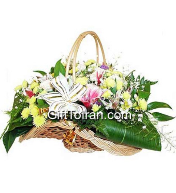 Outburst of colors and paints. Don't hide your emotions; express them with our bright basket arrangement of chrysanthemum, baby’s breathe and greens.