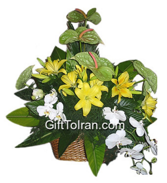 This basket contains 6 roses, 3 gerberas, 2 liliums, 2 violets (zanbagh), and 2.5 kg of...